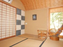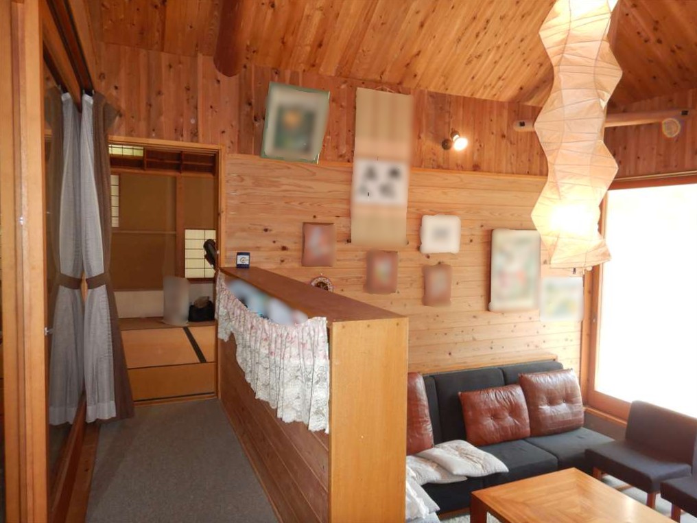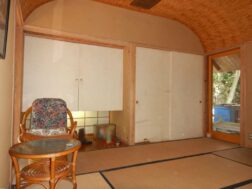 木々に囲まれた静かな環境に佇む平屋建て住宅。大きな窓から光が差し込む、開放感あふれる吹き抜けのリビングが魅力です。玄関には趣ある土間を備え、間取りはゆったりとした2LDK。温泉付きで日々の疲れを癒し、敷地内の木を整えると海や大島を望む眺望も楽しめます。自然と調和した心地よい住まいです。