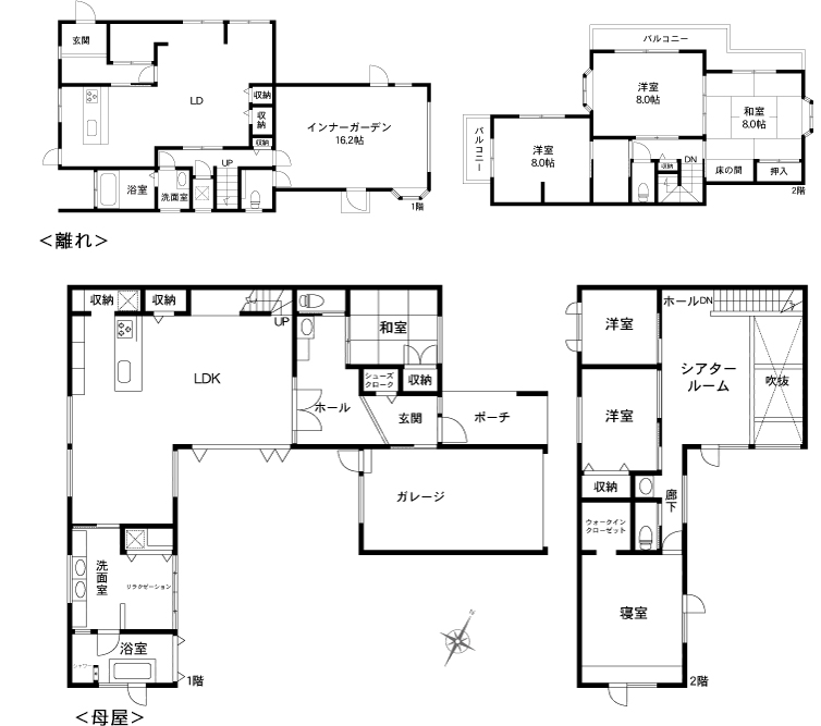建物面積 186㎡(56坪) 築年月 令和7年6月 構造・階数 木造・2階建て 間取り 4LDK+ガレージ+離れ