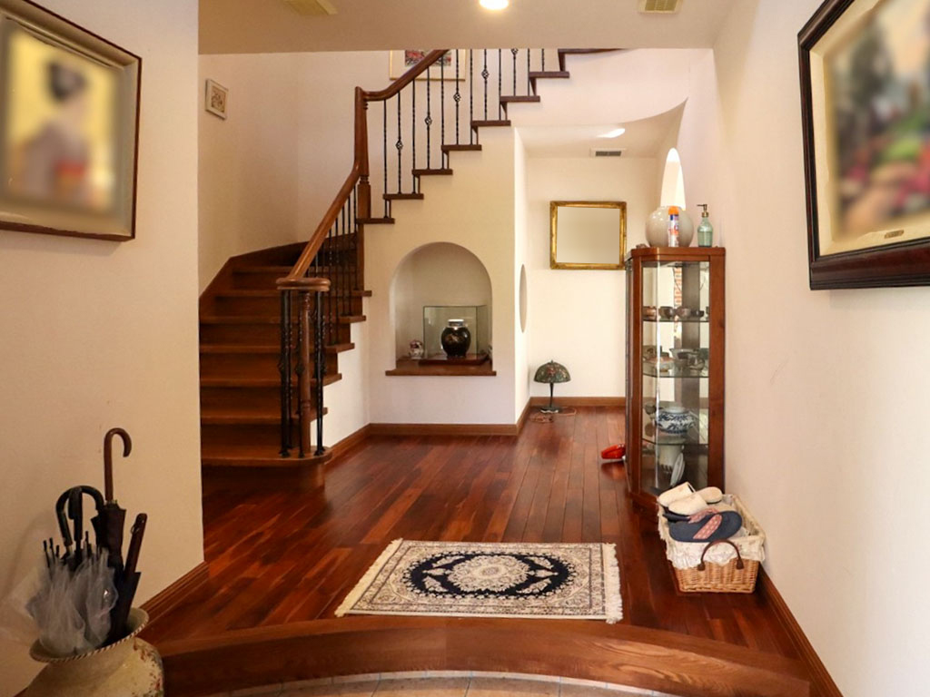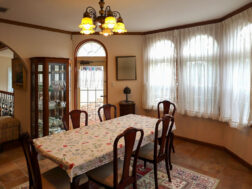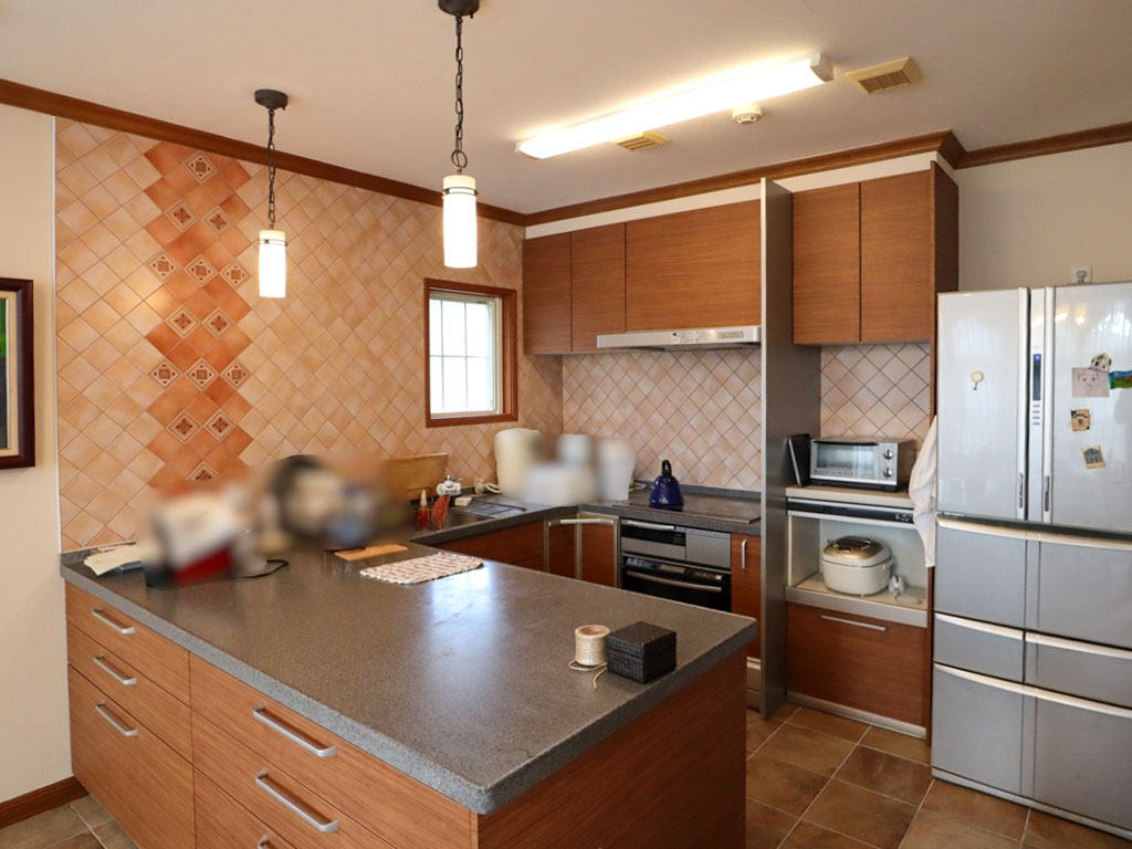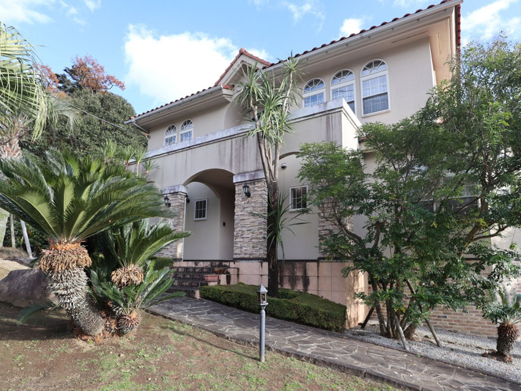 アーチ窓や瓦屋根が印象的な外観に、石張りアプローチと南国風の庭が非日常感を演出します。室内は出窓が連なる明るいダイニングが魅力で、やさしい光と景色を楽しめる空間。愛車を守るガレージ付きで、別荘にも定住にもおすすめの一邸です。
