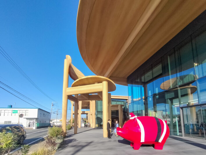 信金店舗の外には、銀行らしく昔懐かしい「ぶたの貯金箱」のオブジェ。