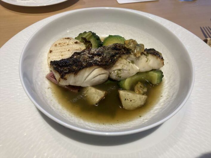 伊豆産折戸茄子、花ニラ、ゴーヤ、じゃがいもとアサリのハーブソース』