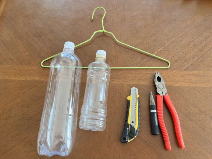 ペットボトルの中央に穴を開け、そこにハンガーを差し込んで支柱とします。