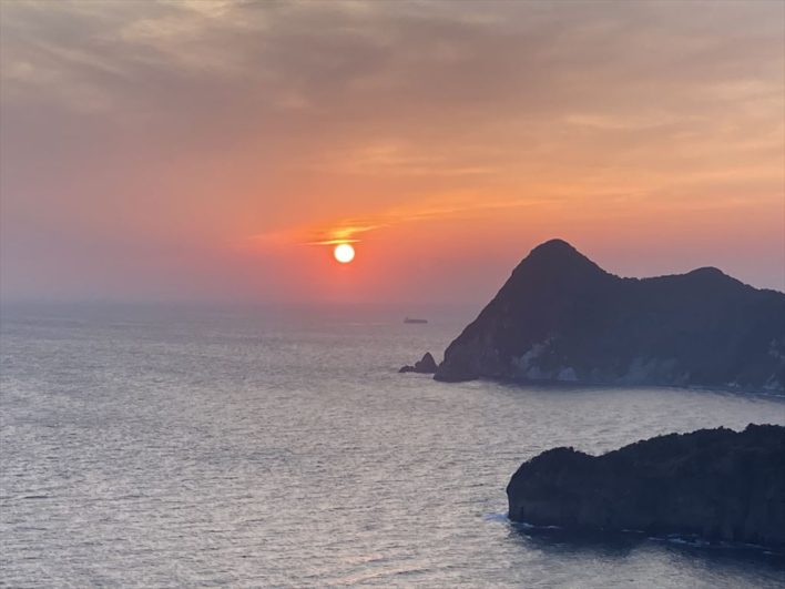 夕日が沈む瞬間に、真っ赤に照らされる大海原。