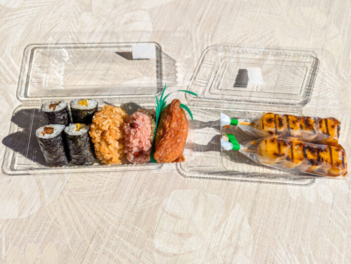 小腹がすき、「くまがや製菓」さんに立ち寄り、おにぎりセットとみたらし団子を購入。