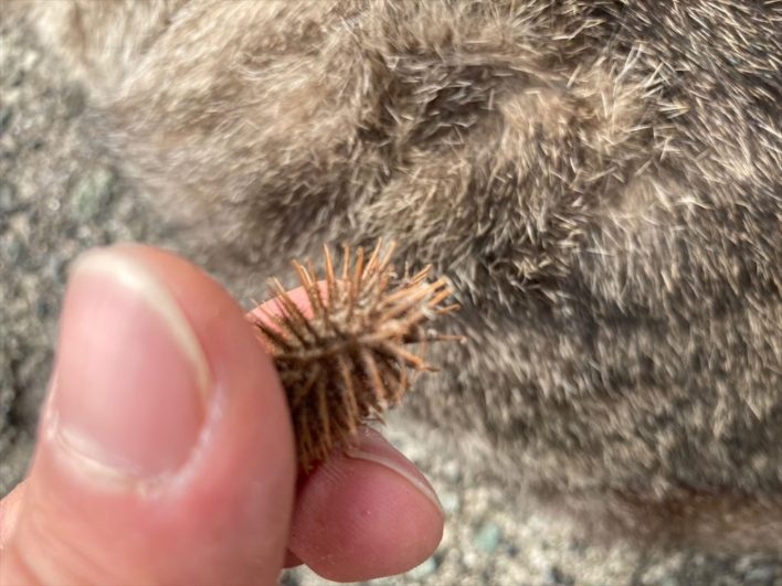 背中にトゲトゲがくっついていたので、取り除いてあげるとご満悦で離れて行きました。