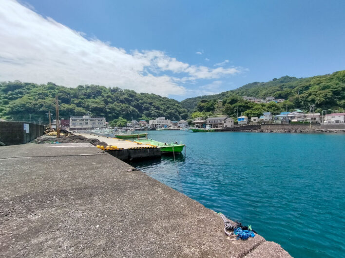 振り返ると川奈港、そして集落と緑の山。絵になる風景です。