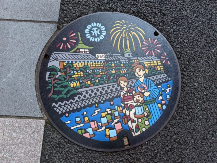 そして東海館の前で1枚、マンホールも東海館の絵が描かれています。