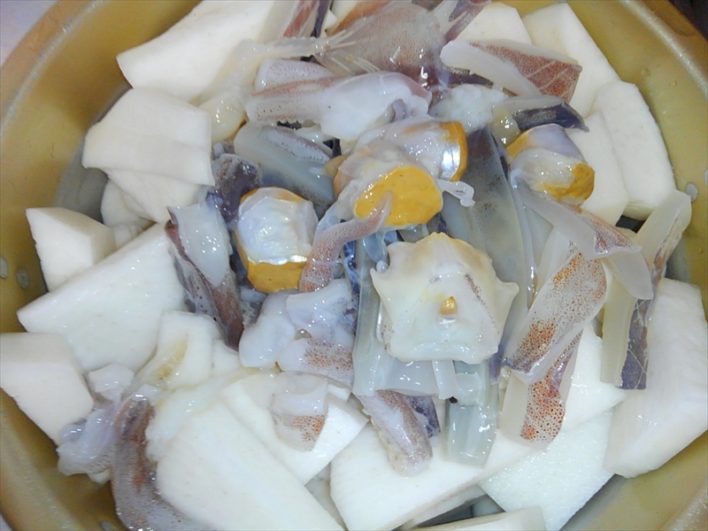 鍋に、桜島大根、スルメイカ、調味料を入れて、煮ました。