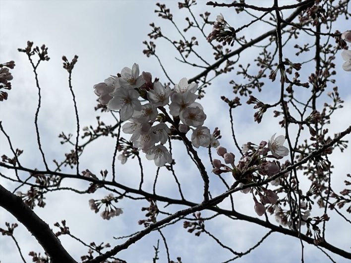 事務所の駐車場入り口前の桜は、七分咲きくらいでしょうか。