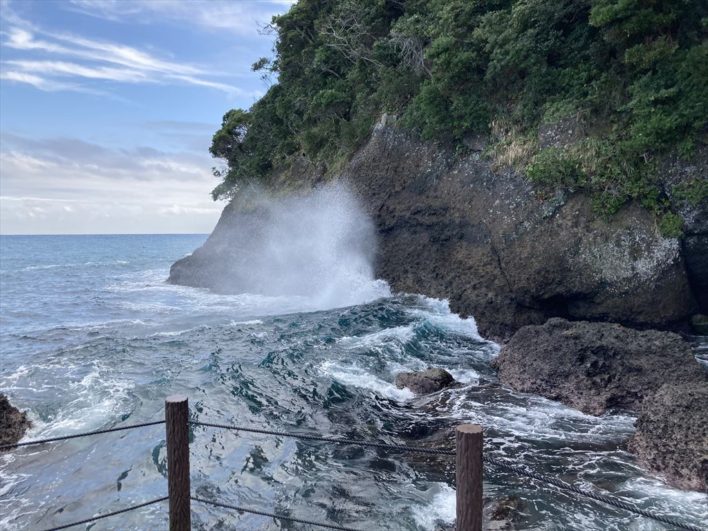 見所は、汐吹き岩です。潮の干潮によって洞窟から潮が吹きあがります。