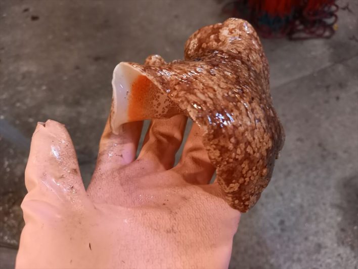 縁の色は薄く、だんだん濃いオレンジになり、中央はまだらです。