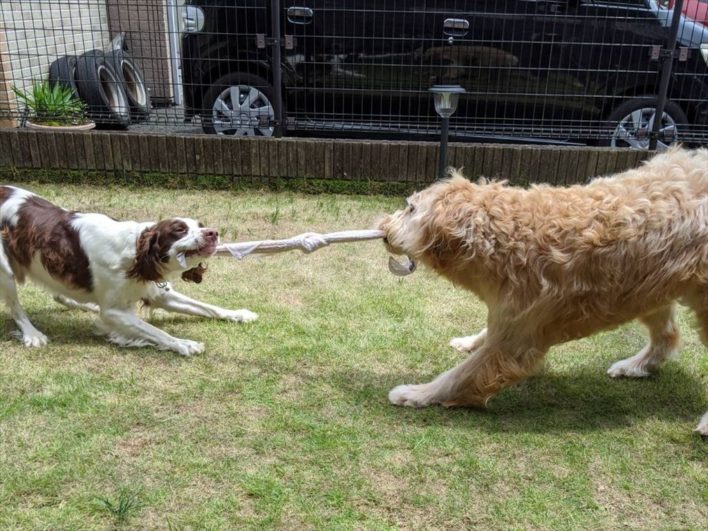 狭いながらも追っかけっこをし、タオルの引っ張り合いとまるも喜んで一緒に遊んでくれました。