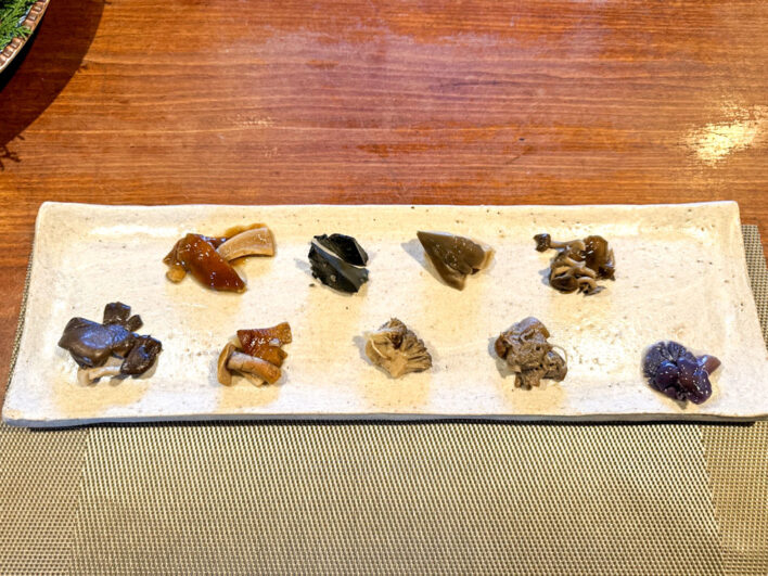 先ずは調理されたお通しのキノコの盛り合わせプレートでスタート。