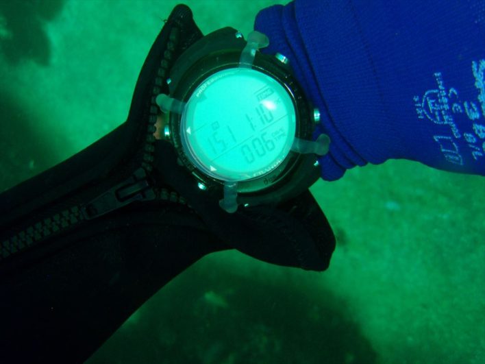 ダイブコンピューターのデータでは、現在の水深は15m(5階建てのビルに相当)です。